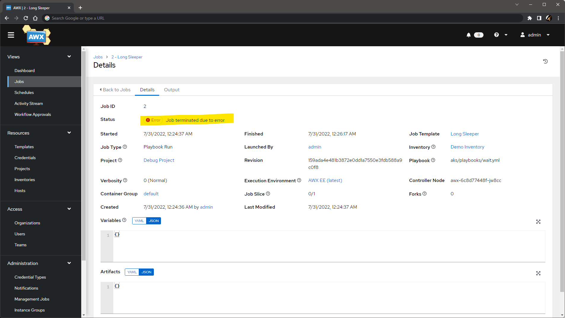 Details タブでは、エラーの理由として Job terminated due to error が記録されます。