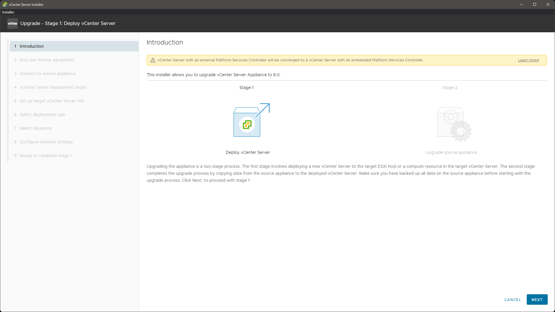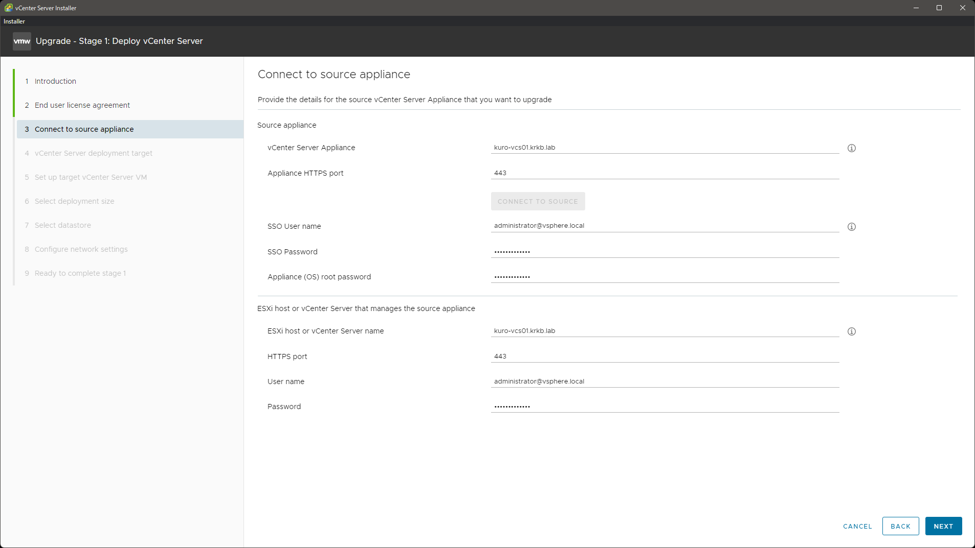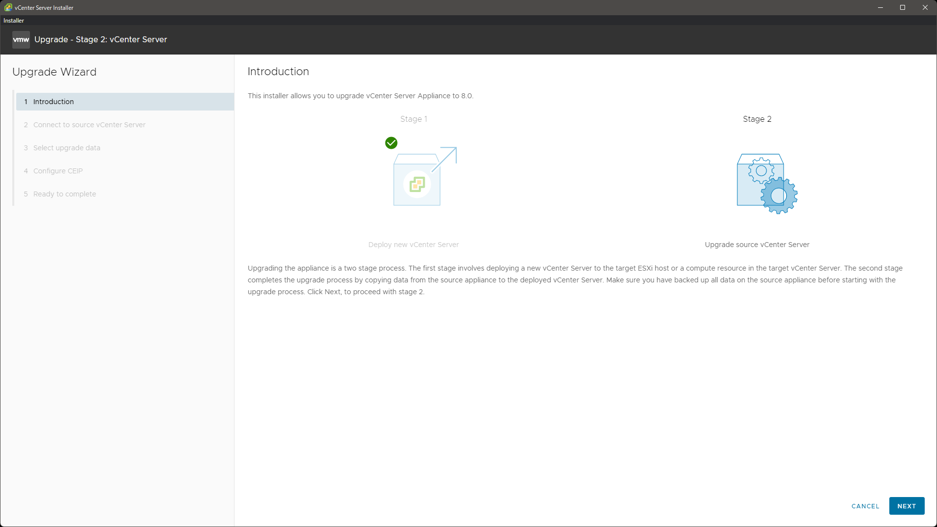 ステージ 2: 移行元 vCenter Server のアップグレード