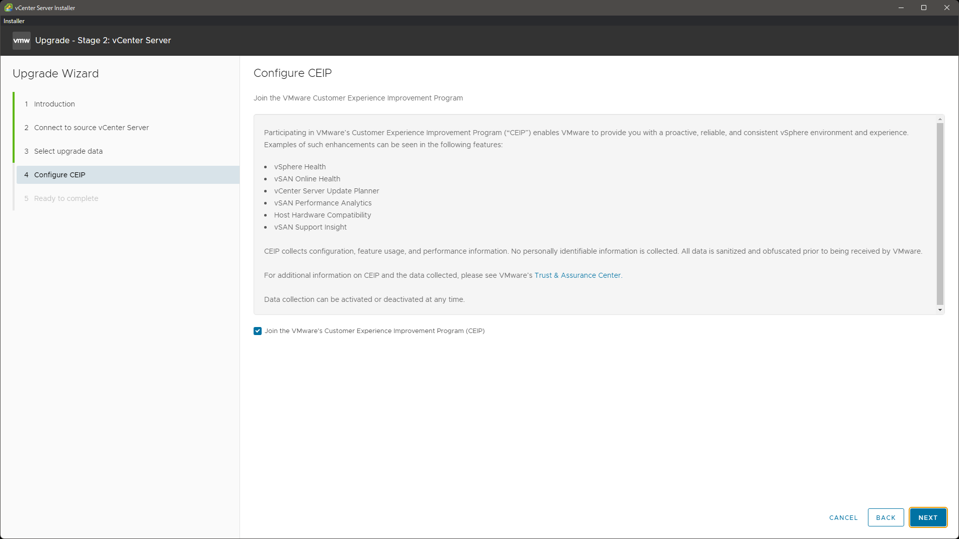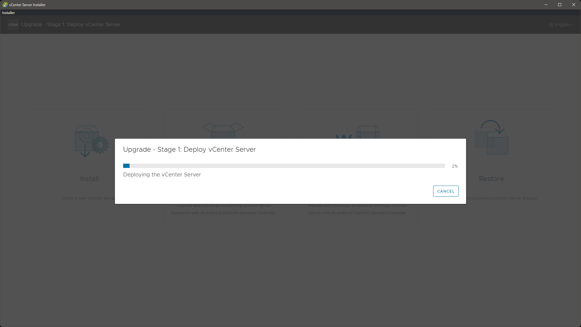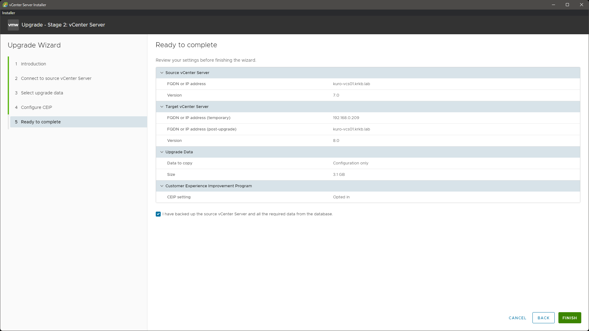 ステージ 2: 移行元 vCenter Server のアップグレード
