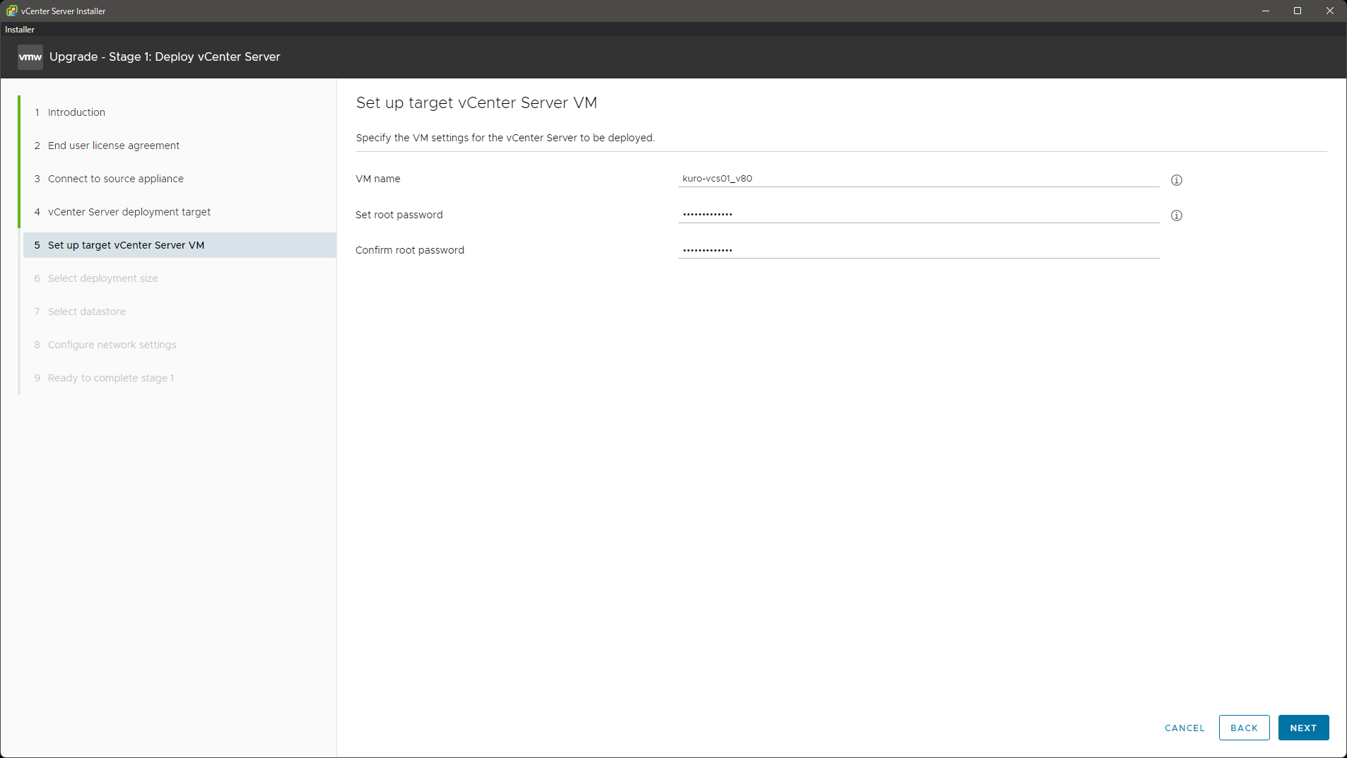 続く画面で移行先の環境情報を指定したら、新しい vCSA の VM 名を指定します。今回の構成では、新 vCSA が旧 vCSA と同じインベントリに並ぶことになるので、名前の競合を避けるために旧 vCSA とは別のものを指定します。