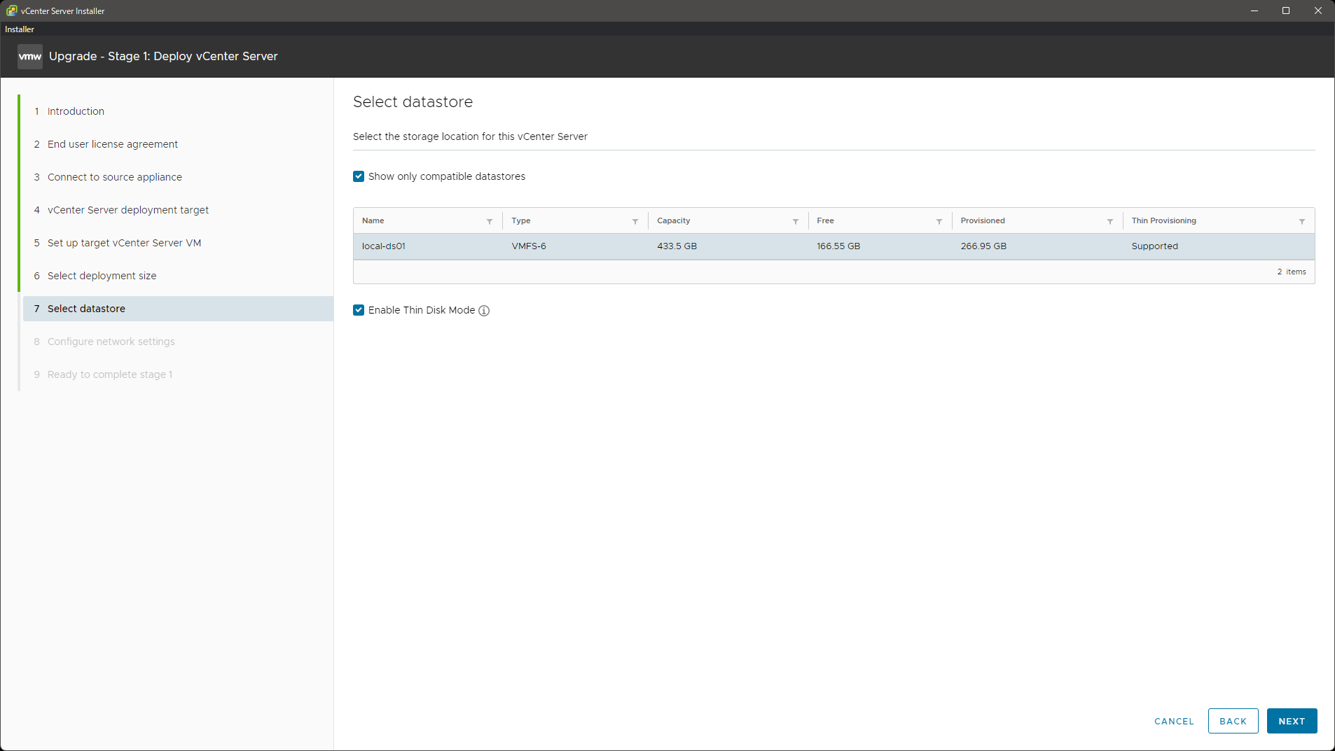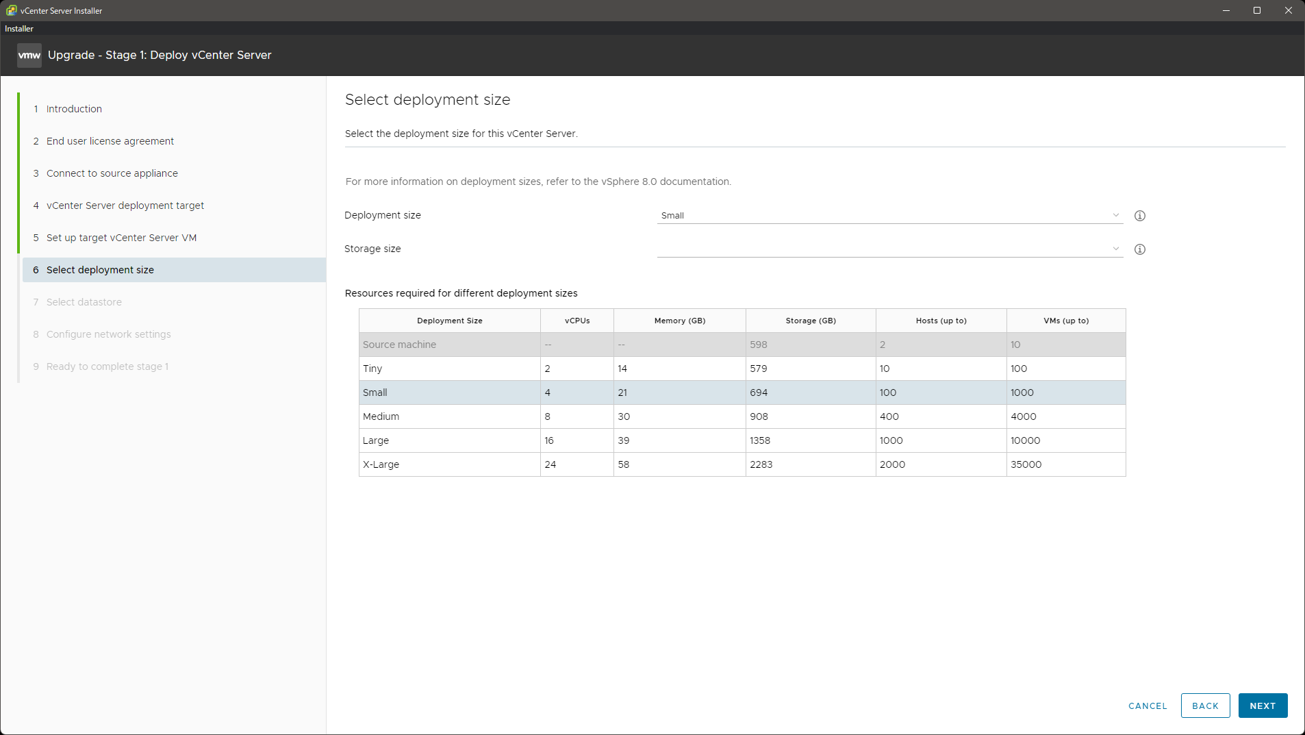 vCSA のサイズで選択できる最小サイズは、移行元の vCSA の CPU とメモリ、ディスクのサイズ(使用量ではなく割当量)から判断されるようです。今回の環境では本当は Tiny で充分ですが、元の vCSA のディスクが少し大きかったので Tiny が選べず、Small にしています。
