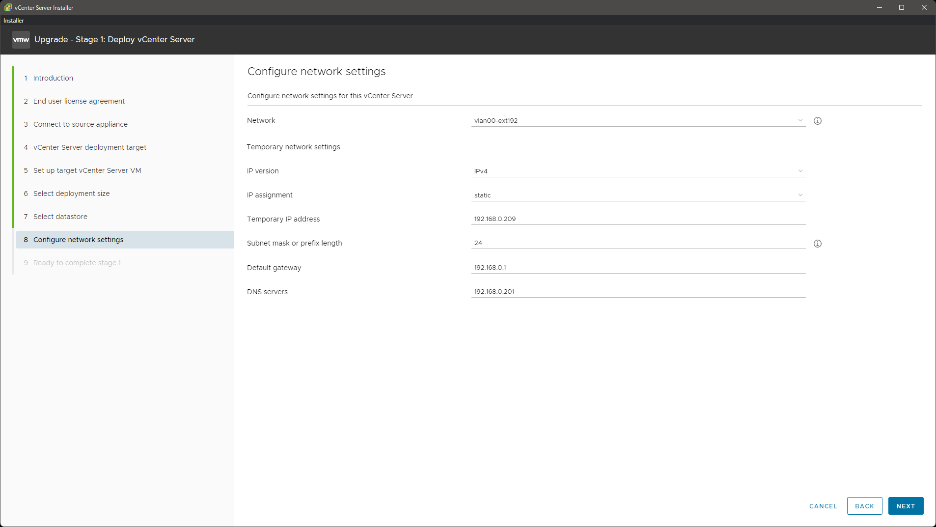 今回、ステージ 1 の完了後、ステージ 2 を開始する前に手動で構成作業を行っています。ステージ 1 までは旧 vCSA を DNS サーバとして使えますが、ステージ 2 ではその過程で旧 vCSA がシャットダウンされ名前解決ができなくなってしまうためです。ステージ 2 も最低限 /etc/hosts さえいじってあれば DNS サーバを使わずとも完遂できますが、ついでに全部やってしまっています。