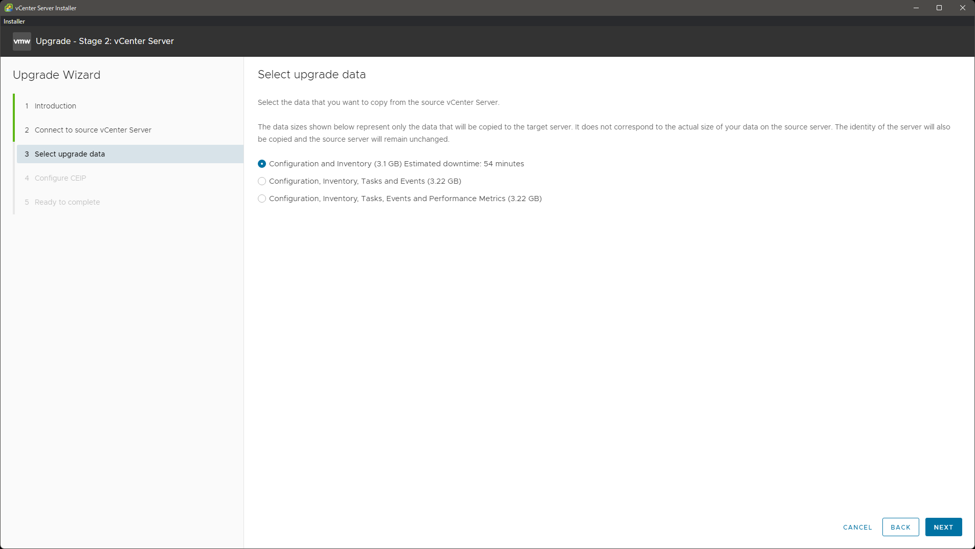 移行元の vCenter Server の情報を渡して、移行する対象のデータを選択します。過去の履歴は破棄して構わないので、今回は設定とインベントリだけ移行させます。