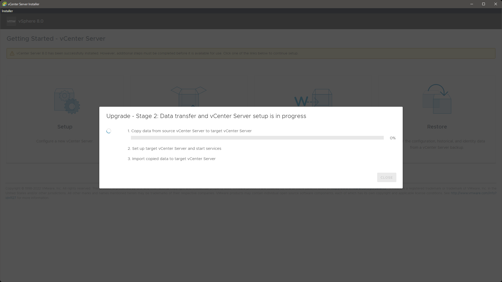 新旧 vCSA 間でデータの移行が行われ、旧 vCSA が停止されます。その後、旧 vCSA の IP アドレスなどのネットワーク設定が新 vCSA に反映されます。