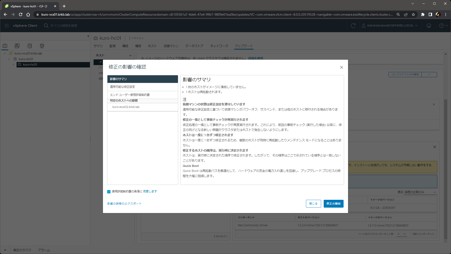 イメージができたら コンプライアンスの確認 をして、ホストごと、あるいはクラスタ全体で 修正 を行えば完了です。
