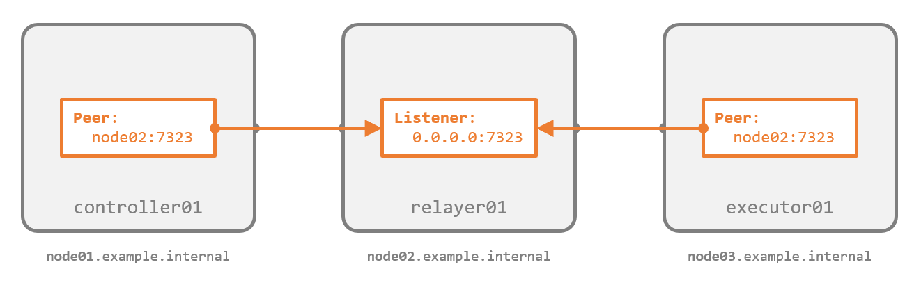 メッシュネットワークは、各ノードで 隣接するノード同士 の バックエンドでの相互の接続方法を設定 することで構成されます。具体的には、隣接する二つのノードについて、一方で 接続を待ち受ける設定(*-listener) を、他方で 接続しに行く設定(*-peer)を行います。