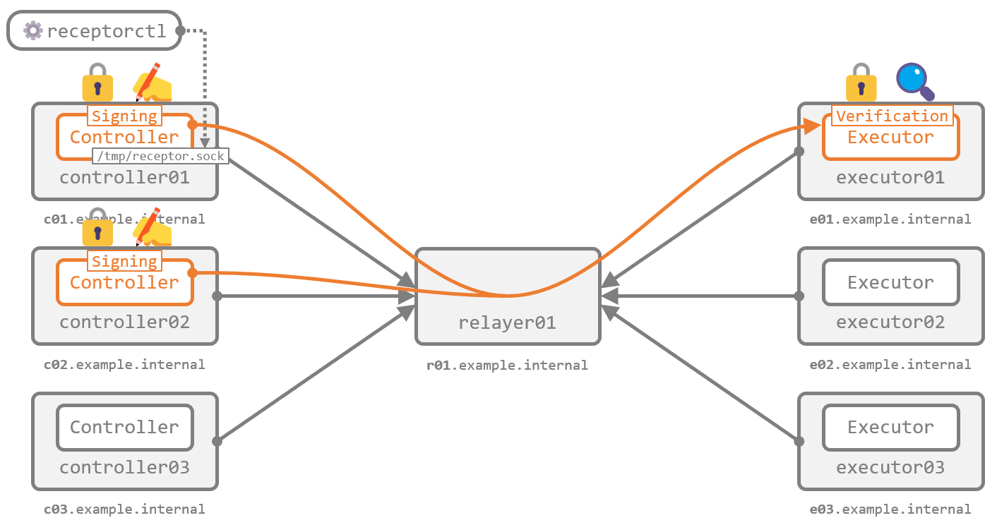 Receptor は、Executor に届いたワークが正当な Controller から送信されたものであることを検証する手段として、ワークへの署名 とその 署名の検証 を行う機能があります。あらかじめ作成した鍵ペアを利用して、Controller 側が秘密鍵で署名 し、Executor 側が公開鍵で検証 する形です。