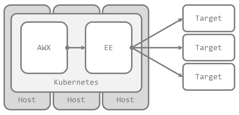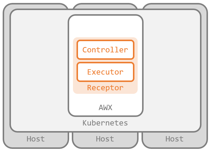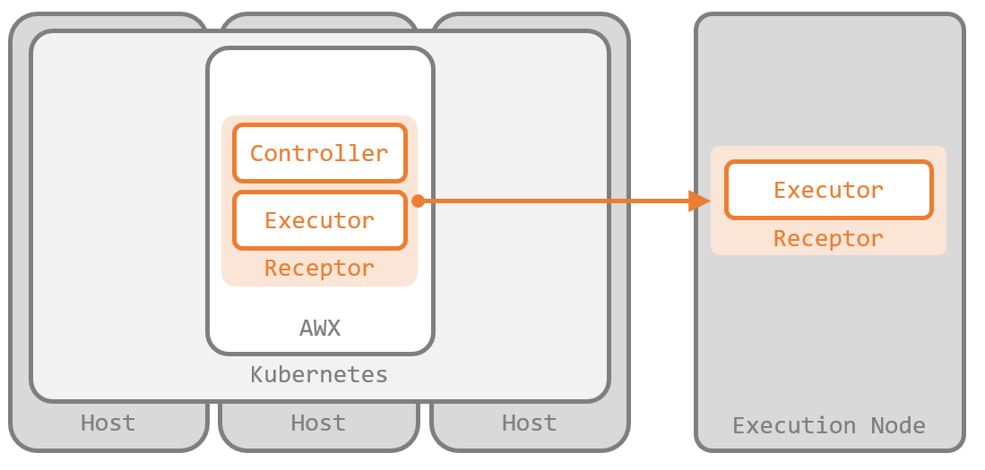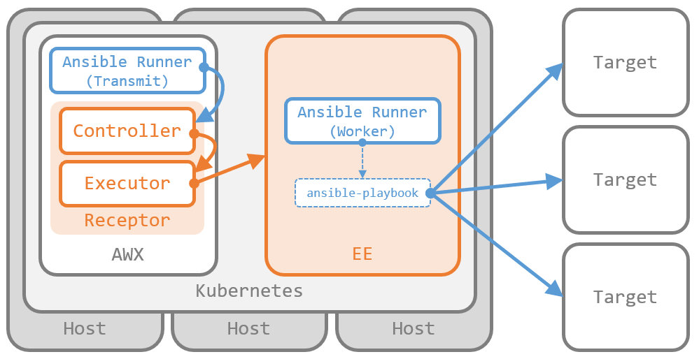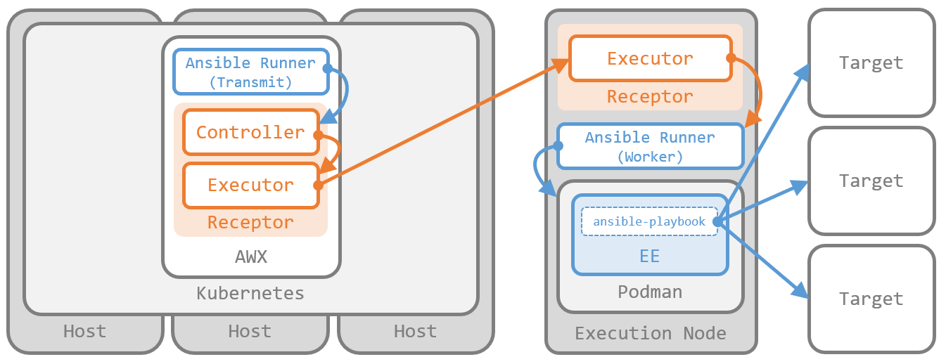 インストール先が OpenShift でなければ Kubernetes ワークの出番が少なくなるくらいで、親玉たる 制御プレーン が 実行先のインスタンスに応じて Ansible Runner と Receptor に渡す情報をコントロール している動きは、結局は AWX と同じです。