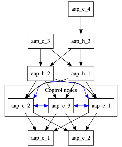 Automation Mesh では上図のような 複雑なトポロジ も構成できますが、これまでのエントリで紹介したように、Receptor では メッシュネットワークが組めさえすればノード間の経路はもはや気にする必要がない わけで、あえて Receptor を介する実装 にすることで、Receptor の持つ柔軟性と拡張性をそのまま AAP の強みにできている とも言えます。