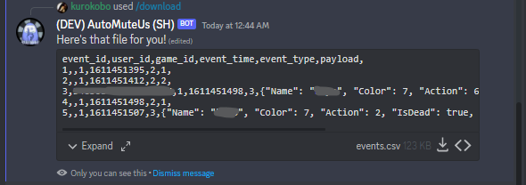 前述の通り、この機能は AutoMuteUs のデータベース内の自ギルドに関するデータを CSV 形式でダウンロードできる ものです。