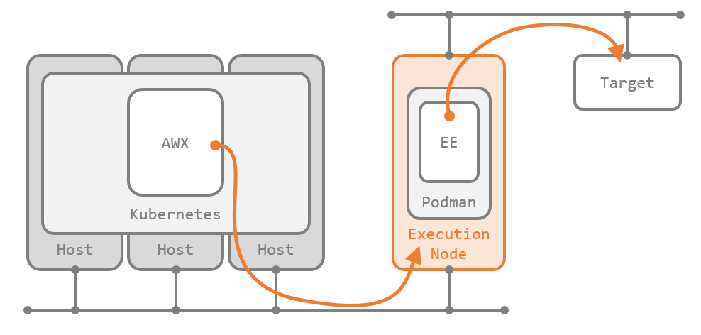 ネットワークの都合で AWX からは直接到達できないターゲットノードに対しても、Execution Node を介してプレイブックを実行できます。