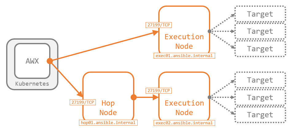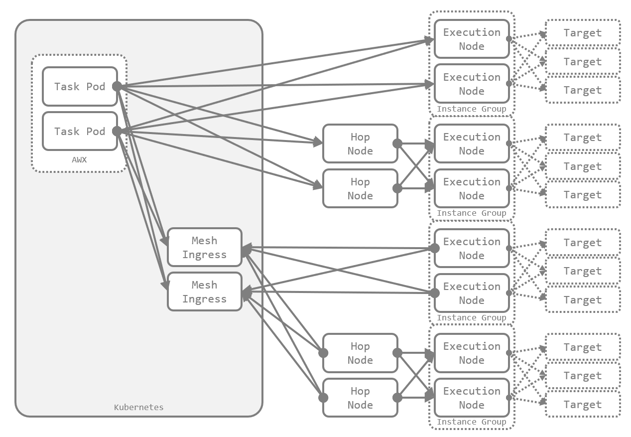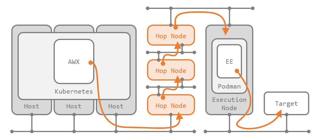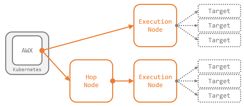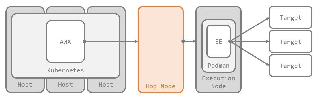 Execution Node が実装された当初は、Execution Node は AWX から直接到達できる範囲にしか配置できませんでした。Hop Node により、任意の数の Hop Node を AWX と Execution Node の間に配置して、ジョブをさらに遠くのネットワークまで届けられるようになりました。
