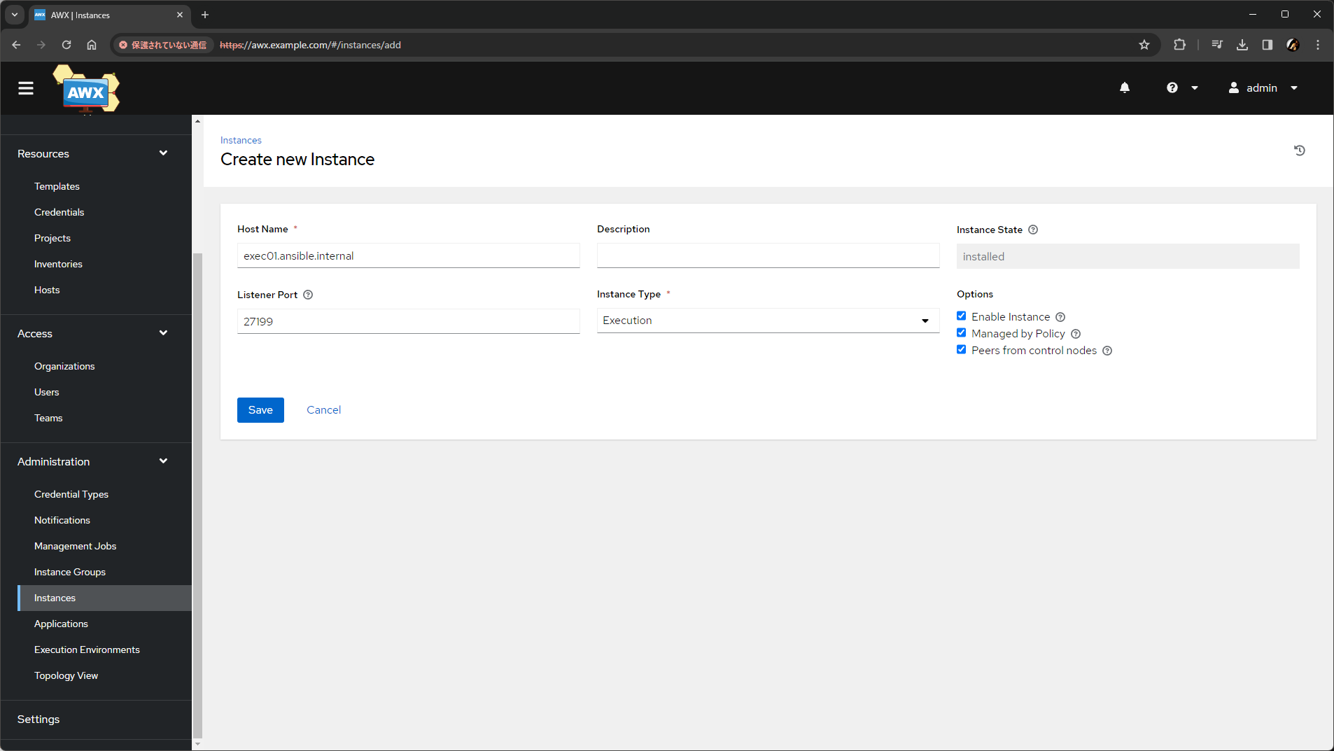 Host Nameとして、そのノードに接続しにくる側(矢印の根元側)で名前解決可能なホスト名(または IP アドレス)を指定します。Listener Portは、そのノードが 接続を受ける側(矢印の先端側)の場合 に入力します。標準は27199です。Instance Typeは、そのノードにあわせてExecutionかHopから選択します。- そのノードが AWX の隣接ノードの場合 は、
