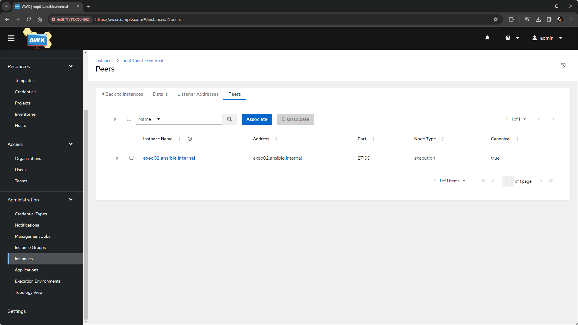 AWX から直接つながるノード(今回の例では exec01 と hop01)へのピア設定は、インスタンスの追加時に Peers from control nodes にチェックをいれたことで完了しています。したがって、今回の構成では hop01.ansible.internal の Peers タブで exec02.ansible.internal を追加すれば完了です。