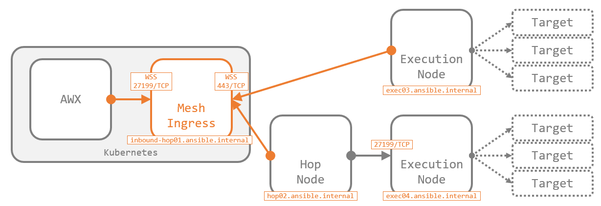 ただし、AWX からその隣接ノードへ は 必ずアウトバウンド方向 で設計します。AWX 以外のノード間の接続方向は任意 です。これを踏まえて、上図にホスト名とポート番号を加えて少しだけ細かくした図が以下です。