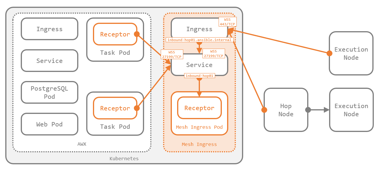 Mesh Ingress は、クラスタ内で AWX からの接続を受け付けるだけでなく、クラスタ外の他のノードからの接続も受け付けます。このとき、クラスタ外の他のノードは Ingress(または Route)を宛先に接続するしかありませんが、==AWX は同じクラスタ内にいる== ため Service を宛先にして接続 しています。