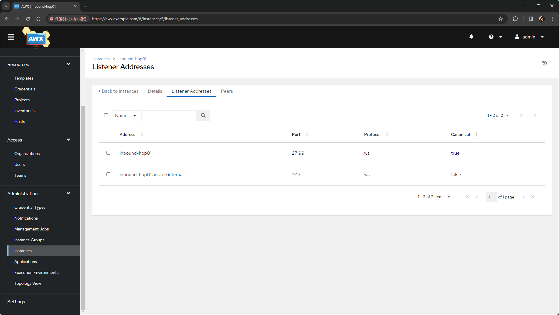 AWX Operator は、AWX へのインスタンスの追加と AWX からのピアの設定も実施するため、AWX の Web UI ではこの段階で Mesh Ingress のインスタンスが確認できます。名前は CR の name で指定したもので、Node Type は hop です。