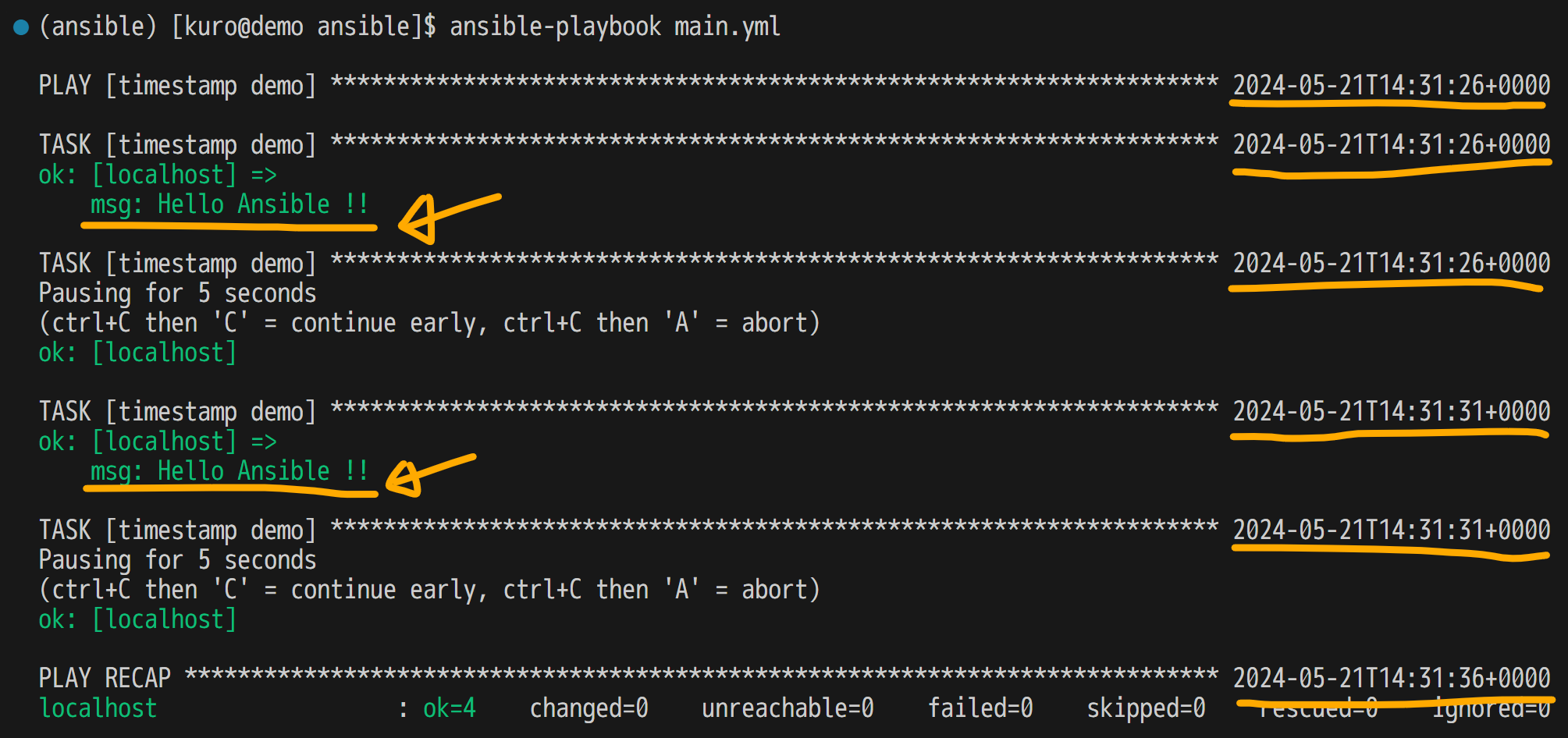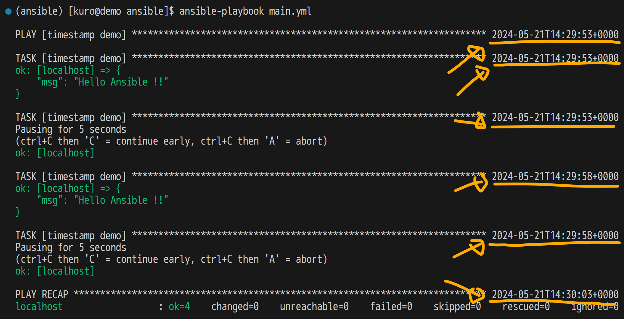 フォーマットは、ansible.cfg の callback_timestamp セクションの format_string、または環境変数 ANSIBLE_CALLBACK_TIMESTAMP_FORMAT_STRING で指定できます。