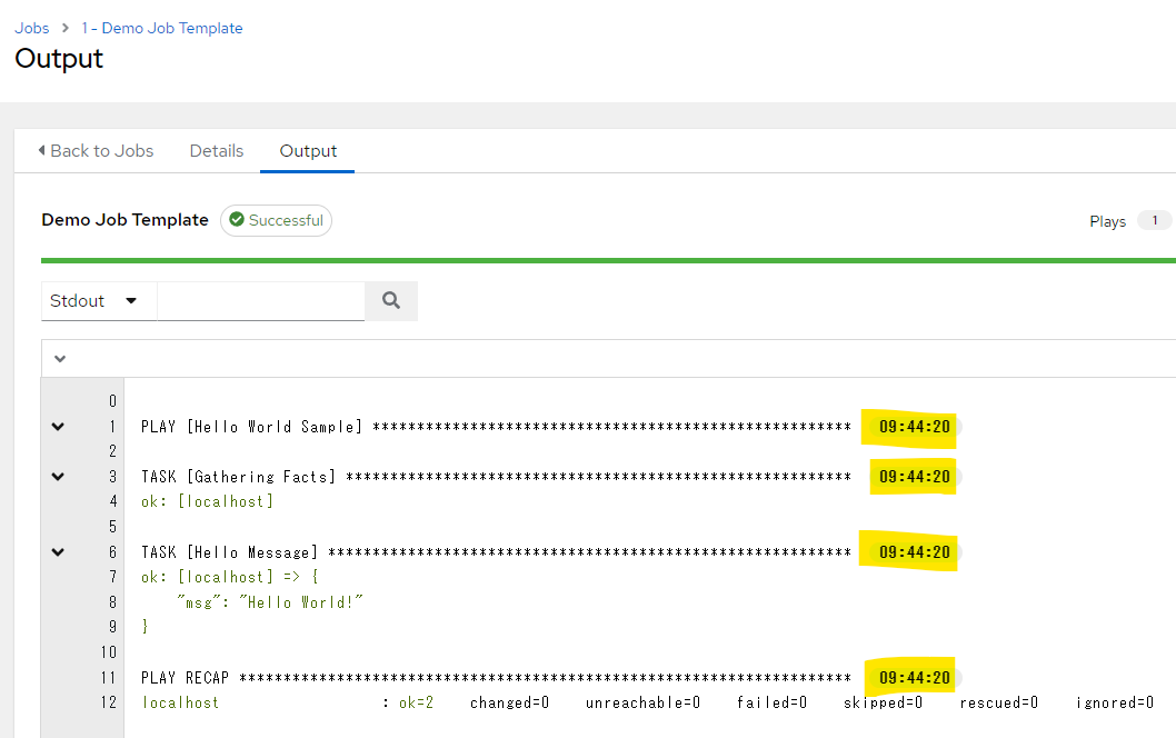 また、Ansible ではなく AWX では、ジョブテンプレートのログの画面で、ヘッダ行にタイムスタンプが表示される仕様です。この仕様をコールバックプラグインとして実装したのが今回のプラグインとも言えます。
